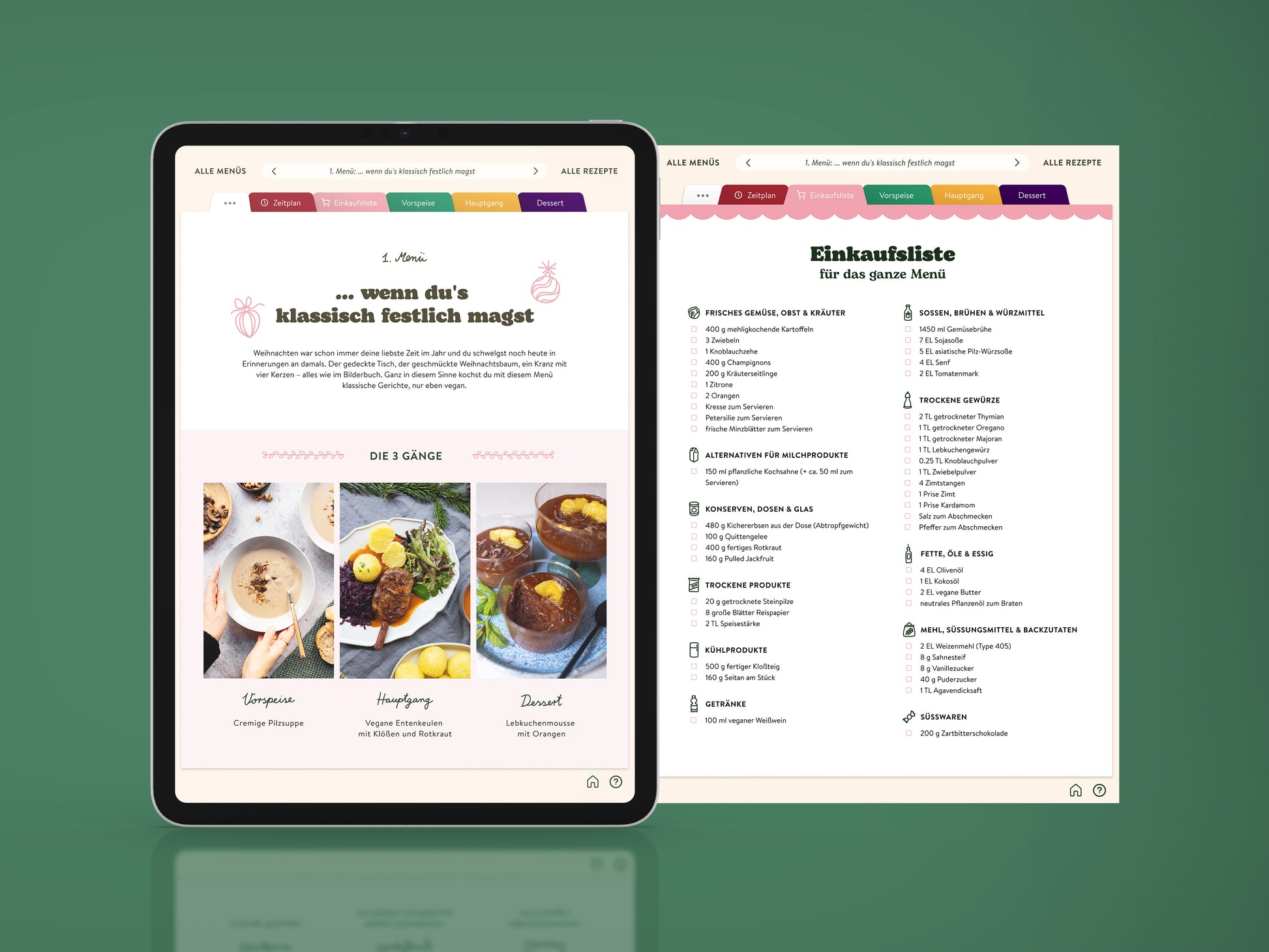 Stressiges Weihnachtsessen? Nicht bei uns! Dieses digitale Kochbuch ist nicht einfach ein E-Book, durch das ihr euch endlos scrollt – es funktioniert fast wie eine App. Mit intuitiver Navigation springt ihr per Klick zwischen 24 komplett durchgeplanten veganen Weihnachtsmenüs hin und her. Jedes Menü besteht aus drei Gängen (Vorspeise, Hauptgang, Dessert), einer sortierten Einkaufsliste und zwei Zeitplänen für eure Vorbereitung.