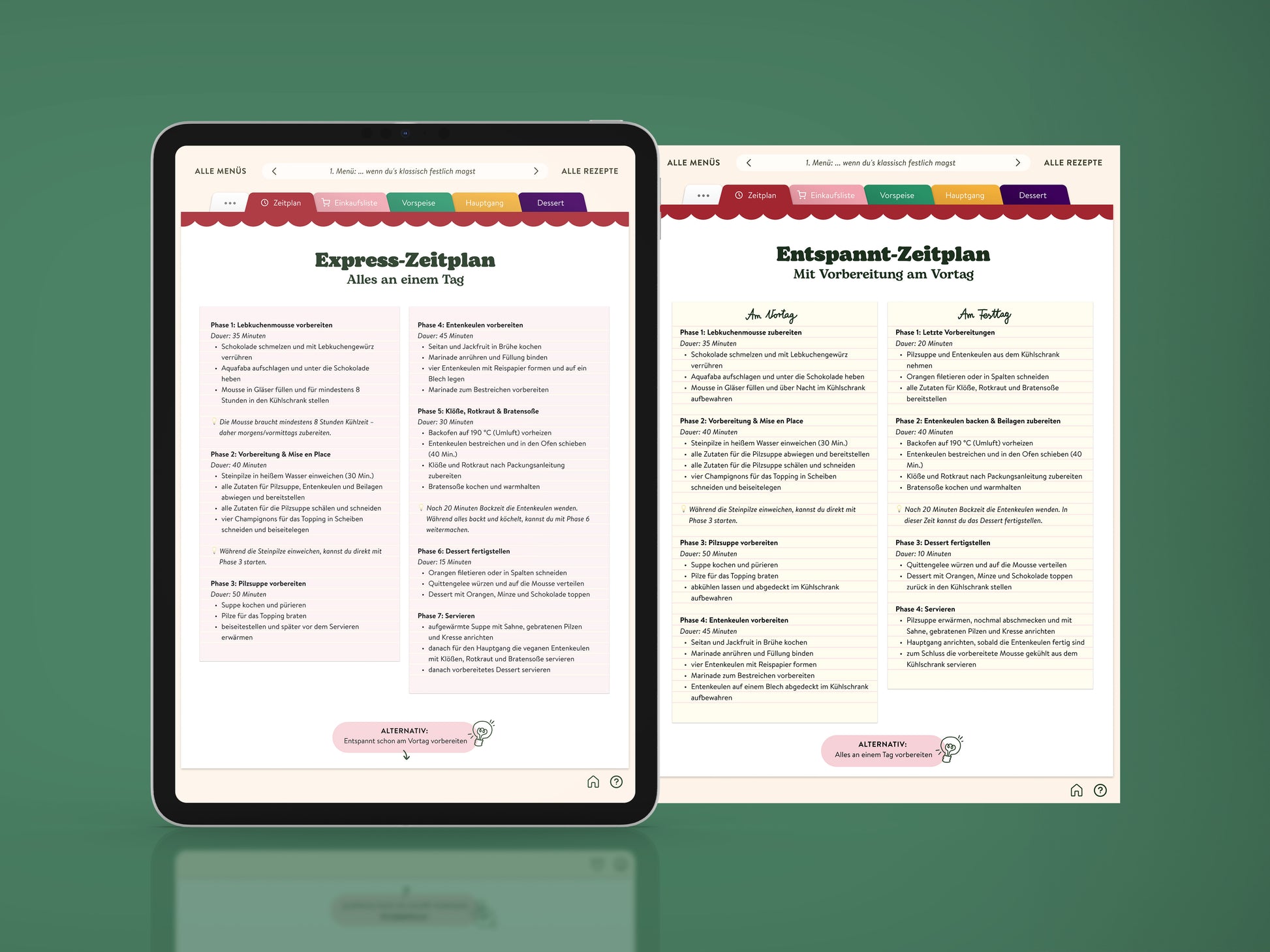 Anders als normale PDFs hat unser Kochbuch eine Navigation mit Tabs – wie Registerkarten in einem handgeschriebenen Rezeptordner. Ihr klickt euch intuitiv durch alle Menüs, Rezepte, Einkaufslisten und Zeitpläne, ohne ewig scrollen zu müssen.